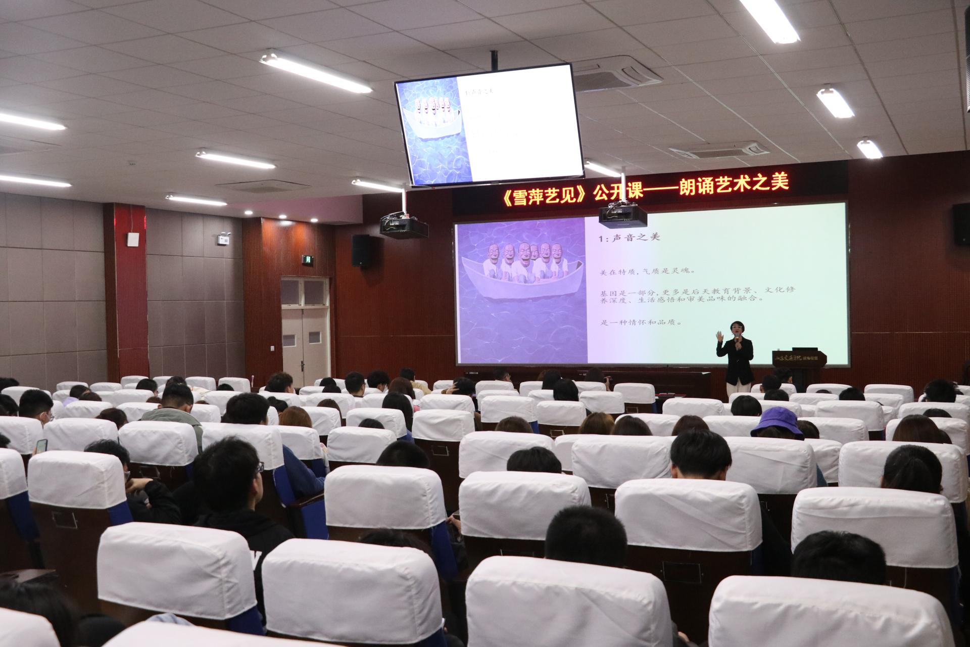雪萍老师从艺术的“声音之美”、“文字之美”、“音律之美”、“文学之美”、“绘画之美”、“意境之美”六个方面以独特的视角进行了至情至性的诠释;以声情并茂、真挚感人的讲授风格,让在场的的同学们感受到朗诵艺术深邃真切的力量,在生活中更加勇于表达自我,提升生命维度,获得幸福、品质生活的能力。