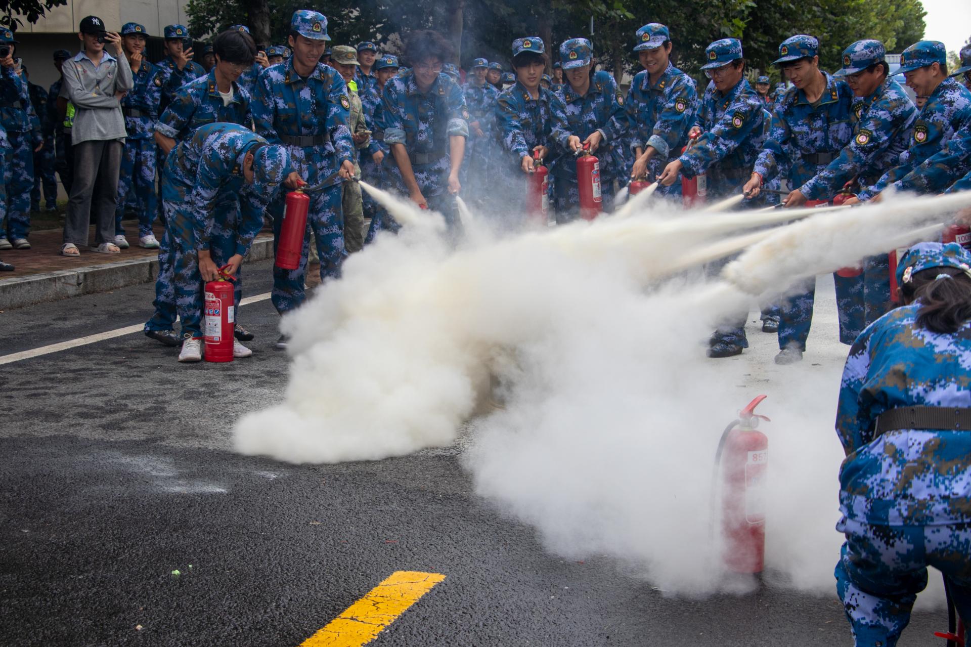 消防应急演练现场,新生在消防教官指挥下用湿毛巾捂紧口鼻、低姿弯腰,沿预定路线快速有序撤离至安全区域,展现出良好的纪律性与应急能力。